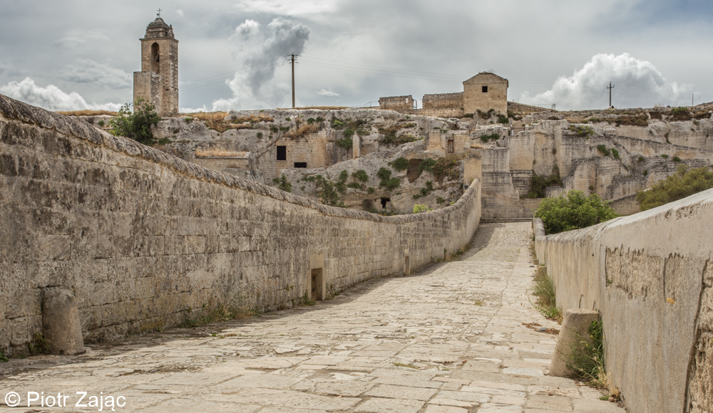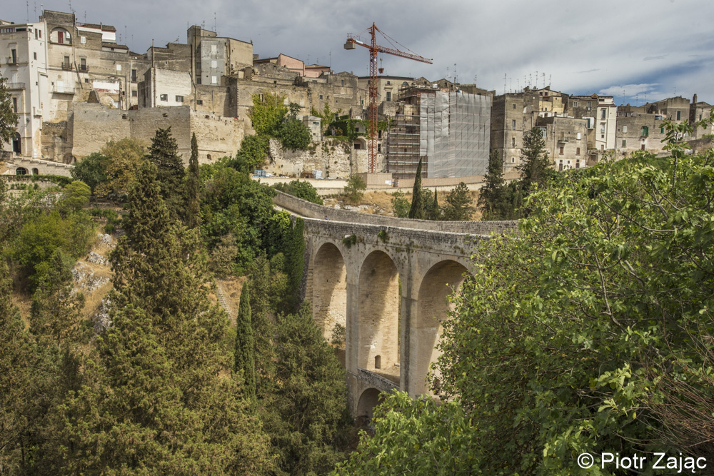 In the film it is supposed to be in Sassi do Matera, but in reality there is no such viaduct there. This film sequence was shot at the Ponte Acquedotto Madonna della Stella in Gravina in Puglia, about 25 km northeast of Matera. This bridge connects the town Gravina in Puglia with the archaeological park of Botromagno in Gravina (Parco Archeologico di Botromagno).